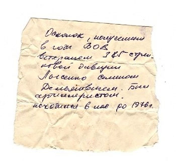 В фонде МДМ М.В.Фрунзе хранится осколок, извлечённый врачами после войны из раны участника Великой Отечественной войны Семёна Демьяновича Лысенко. Вместе с ним в архиве сохранилась записка, оставленная самим фронтовиком. Осколок многие годы находился в теле солдата и со временем превратился в уникальный исторический артефакт — немой, но выразительный свидетель войны.